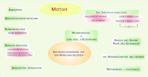 Rudolf Steiner hat von frühester Jugend an mit naturwissenschaftlichen Fragestellungen gerungen. Auch sein Bildungsgang war zunächst naturwissenschaftlich-technisch ausgerichtet. Die von materialistischer Grundhaltung geprägte Naturwissenschaft, die ihm da begegnete, konnte ihn aber nicht befriedigen. Er suchte ein naturwissenschaftliches Denken, das offen ist für eine geistige Perspektive. Zunächst waren es die Begriffe von Raum und Zeit, deren Ungenügen ihn sehr beschäftigte, später war es die in der Physik herrschende Lehre der Wellennatur des Lichtes und in der Biologie die Entwicklungslehre, die ihn herausforderten. Diese Auseinandersetzungen führten ihn zu Goethe. Er entwarf eine Erkenntnistheorie, die eine Rechtfertigung der goetheschen Methode war und zugleich seine eigene Natur- und Geistanschauung harmonisch verbinden konnte. Das, was er dann später als Anthroposophie vertreten hat, begründete er als eine naturgemäße Weiterentwicklung der Naturwissenschaft. Anthroposophie war deshalb für ihn nie ein Gegensatz zu einer richtig verstandenen Naturwissenschaft. Er hat dann später auch innerhalb seiner Tätigkeit für die Anthroposophie Anregungen für eine Erweiterung der Wissenschaften und speziell der Naturwissenschaften gegeben. In drei naturwissenschaftlichen Kursen für die Lehrer der ersten Waldorfschule hat er konkret über insbesondere physikalische Themen gesprochen und weitreichende Ideen entwickelt. Im zweiten Teil des Aufsatzes werden Motive aus diesen Kursen zusammengestellt. Dazu gehört das Aufgreifen und Anknüpfen an aktuelle Forschungsergebnisse, eine Anerkennung der Bewusstseinsentwicklung der Menschheit und einer dementsprechenden Entwicklung der Wissenschaftsmethodik und die Phänomenologie als zeitgemäßer Ausgangspunkt der Naturwissenschaft. Naturwissenschaftliche Begriffe wurden von Rudolf Steiner immer im Zusammenhang mit dem Menschen gebildet, dabei kam es ihm darauf an, den Menschen in seiner leiblichen und geistig-seelischen Totalität im Zusammenhang des gesamten Kosmos zu betrachten. Das Lebendige (in anthroposophischer Nomenklatur das Ätherische) wird als eigenständige Entität erkannt und daraus ein zur Erfassung des Lebens adäquater neuer Zeit- und Raumbegriff gebildet. Indem die Entwicklung der naturwissenschaftlichen Fragen im Lebenslauf Rudolf Steiners und die dazu gehörigen Antworten als Motive des Gesamtimpulses nebeneinander gestellt werden, werden die persönliche Bedeutung und die Kontinuität dieses Themas für Rudolf Steiner deutlich. Auf seine frühen Jugendfragen fand er Antworten durch die Ausbildung der anthroposophischen Geisteswissenschaft. Die Zusammenstellung der Motive ergibt ein Gesamtbild, das die Einheit dieses Impulses deutlich macht und eine Hilfe sein kann, um anknüpfend an Steiners Ideen naturwissenschaftliche Themen zu bearbeiten.